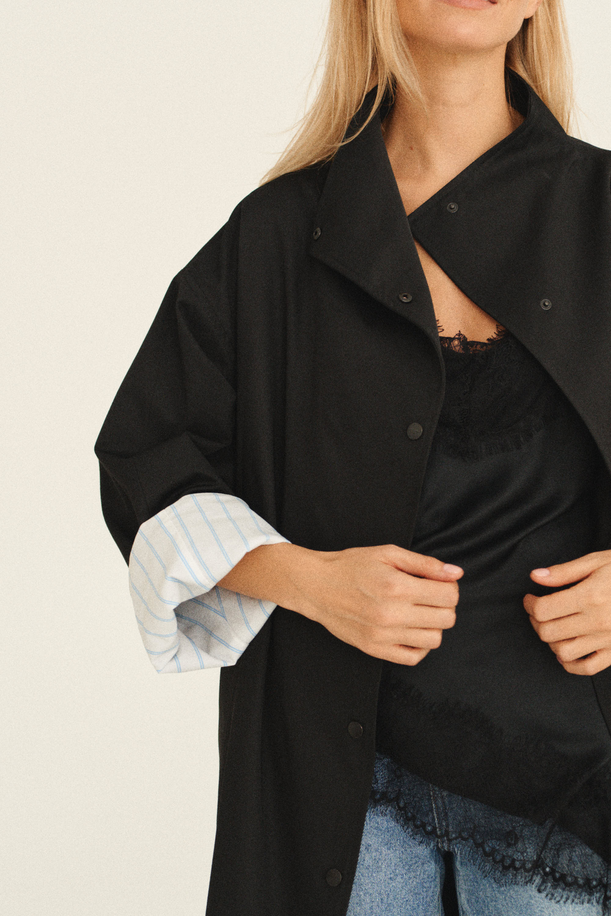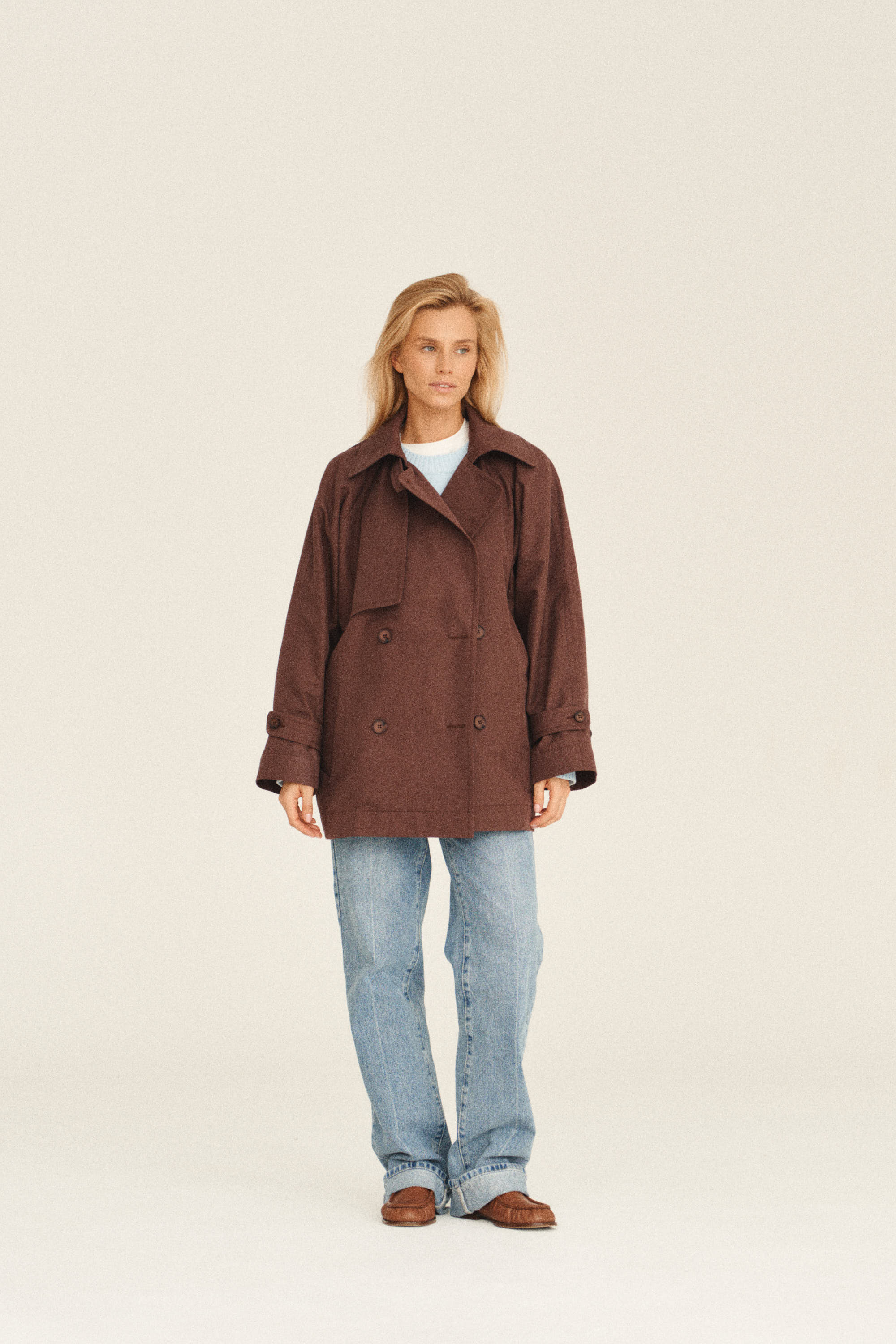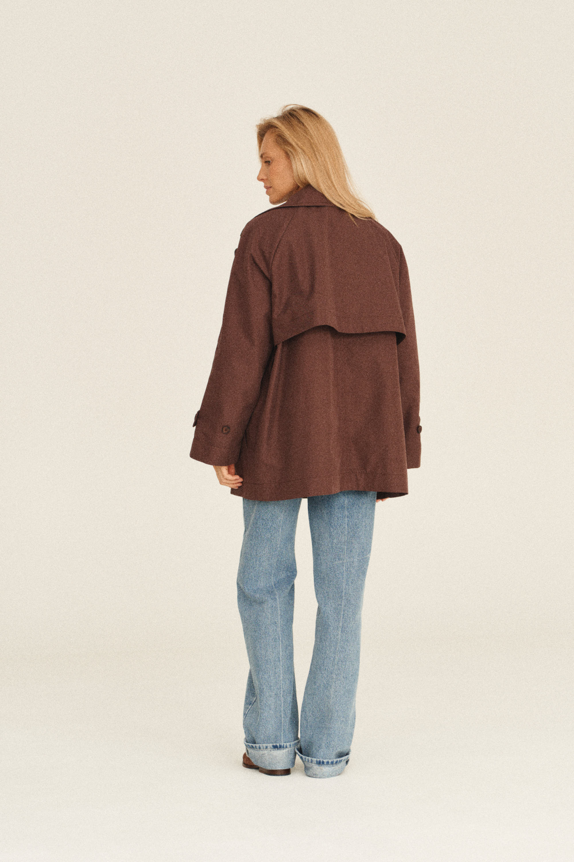 Куртка-тренч выполнена из хлопковой ткани, которая пропитана влаго/ветро защитой. Куртка без подкладки, внутри изделие окантовано контрастной хлопковой тканью, что делает красивый и деликатный акцент. В комплекте идет пояс.